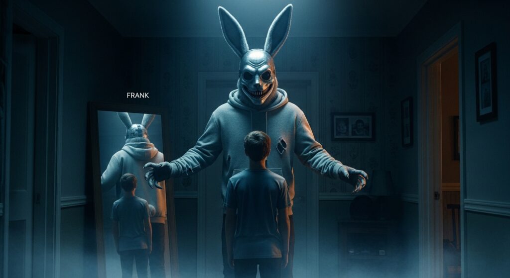 Frank, o coelho gigante aterrorizante que assombra Donnie Darko, é muito mais do que apenas uma figura de horror visual memorável. Na psicologia junguiana, a “sombra” representa aspectos reprimidos da psique—impulsos, desejos e verdades que o ego consciente rejeita ou teme. Frank funciona como manifestação externa da própria sombra de Donnie, guiando-o a confrontar verdades desconfortáveis sobre si mesmo, sua comunidade e a natureza da realidade. A máscara de coelho é significativa: coelhos são símbolos de fertilidade, renascimento e, em Alice no País das Maravilhas, guias para realidades alternativas. Frank literalmente leva Donnie através do espelho para uma realidade onde regras normais não se aplicam.