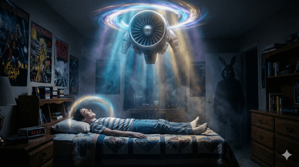 Para compreender o significado oculto de Donnie Darko, precisamos primeiro entender a estrutura de ficção científica que sustenta o filme. O conceito central é o “universo tangente”—uma realidade alternativa instável que se ramifica do universo primário e está destinada a colapsar. No filme, o universo tangente é criado quando o motor do avião atravessa um portal temporal e aparece misteriosamente acima da casa de Donnie. Este evento impossível cria uma linha temporal corrupta que existirá por exatamente 28 dias, 6 horas, 42 minutos e 12 segundos antes de colapsar em um buraco negro que destruirá toda a existência. O livro fictício “A Filosofia da Viagem no Tempo” de Roberta Sparrow fornece a estrutura teórica para esse fenômeno, embora Kelly deliberadamente mantenha muitos detalhes ambíguos.