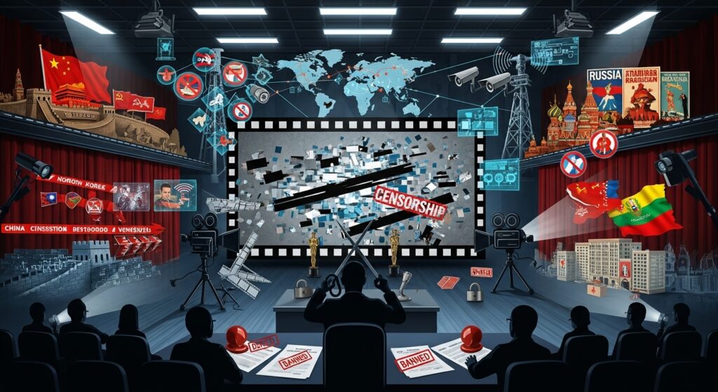 Governos autoritários e regimes com controle estrito sobre narrativas públicas frequentemente utilizam proibição cinematográfica como ferramenta de controle político. Na China, sistema de censura extremamente rigoroso bane filmes que retratam governo de forma negativa, mencionam eventos históricos sensíveis como massacre da Praça Tiananmen, mostram Taiwan ou Tibet como entidades independentes, ou apresentam elementos sobrenaturais de certas formas consideradas “supersticiosas”. Filmes de Hollywood que desejam acessar lucrativo mercado chinês frequentemente autocensuram ou criam versões alternativas para aprovação. A Coreia do Norte mantém proibição quase total de cinema estrangeiro, permitindo apenas produções aprovadas que reforçam ideologia do regime. Rússia intensificou censura cinematográfica em anos recentes, proibindo filmes que “promovem propaganda LGBTQ+” ou apresentam história soviética de formas não alinhadas com narrativa oficial do Kremlin.
