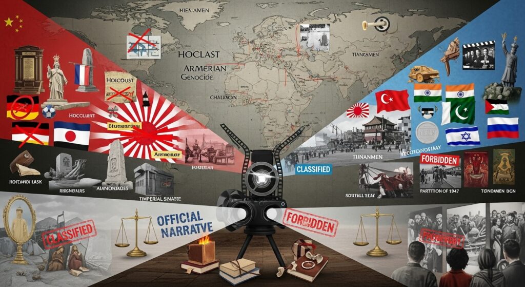 Filmes que abordam eventos históricos traumáticos de formas consideradas ofensivas, imprecisas ou negacionistas frequentemente são banidos em países com conexões diretas àqueles eventos. Várias nações europeias criminalizam negação do Holocausto, e filmes percebidos como minimizando ou distorcendo genocídio nazista enfrentam proibição legal. Alemanha, Áustria e França mantêm leis específicas contra material que promove ideologia nazista ou nega crimes contra humanidade. Ironicamente, isto resultou em proibições de algumas produções anti-nazistas por incluírem simbolismo nazista histórico, embora contexto seja claramente crítico. Turquia proíbe filmes que reconhecem genocídio armênio como genocídio, considerando isso insulto à identidade nacional turca. Japão historicamente censurou ou desencorajou filmes que retratam atrocidades cometidas pelo Império Japonês durante Segunda Guerra Mundial de formas consideradas excessivamente críticas à nação.